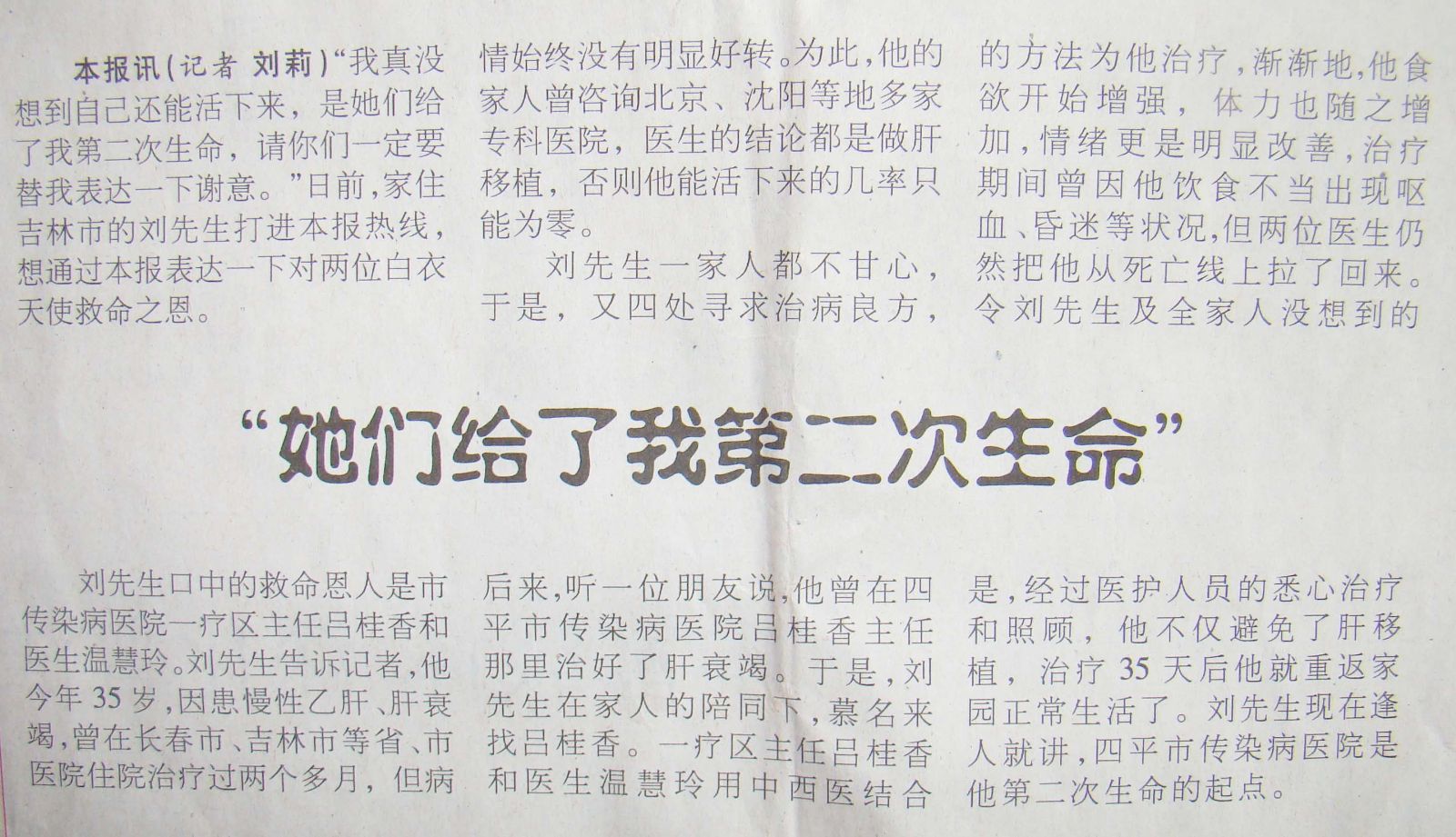 “她們給了我第二次生命”這是四平日?qǐng)?bào)2014年1月8日第八版刊登的文章。敘述了一療區(qū)全體醫(yī)護(hù)人員為“非肝移植無(wú)法生存”的吉林市35歲患者劉先生治療好轉(zhuǎn)的簡(jiǎn)單經(jīng)過(guò)。